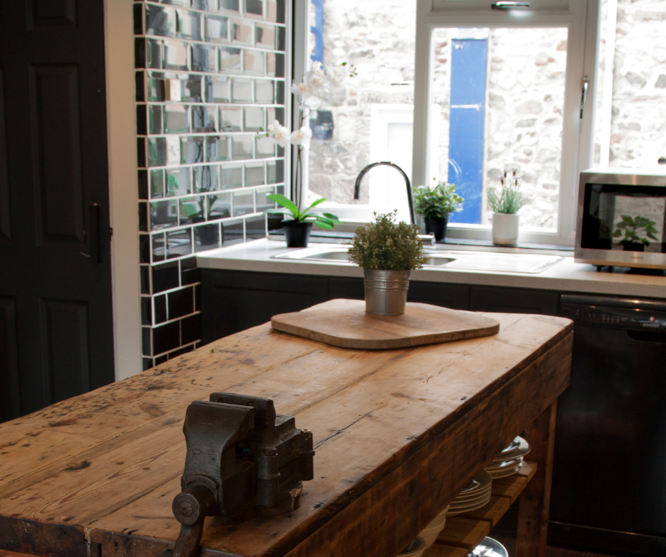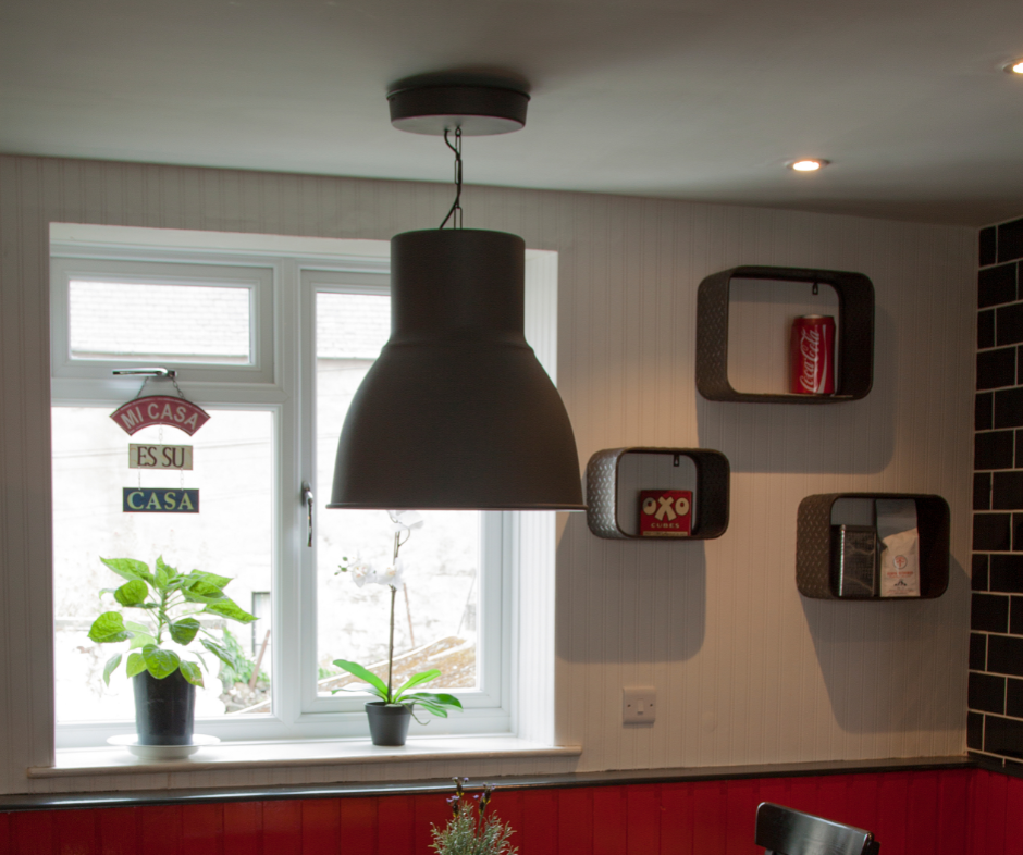 Three huge steel beams had to go in to support the weight of the bedrooms above! Budget to this growing family was key, so we compromised by leaving a nib of the stone wall in situ. We hid the tall kitchen units behind this so it all appeared to be planned in. A blackboard feature dressed up the rest of it and would now be a cool way to write up shopping and to do lists by everyone in the family!