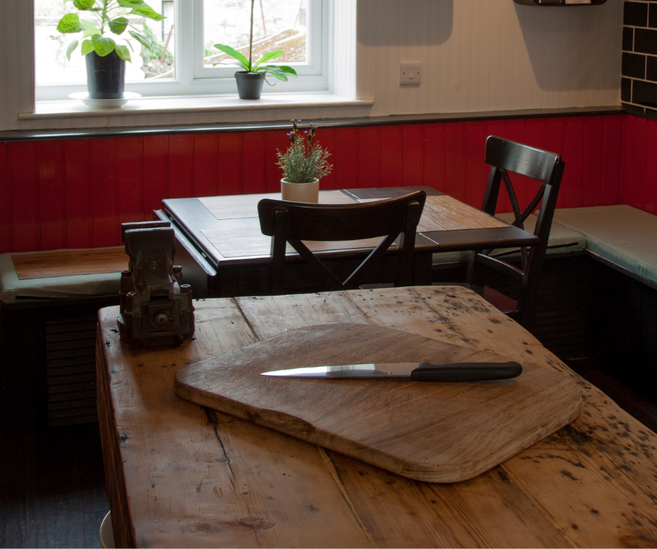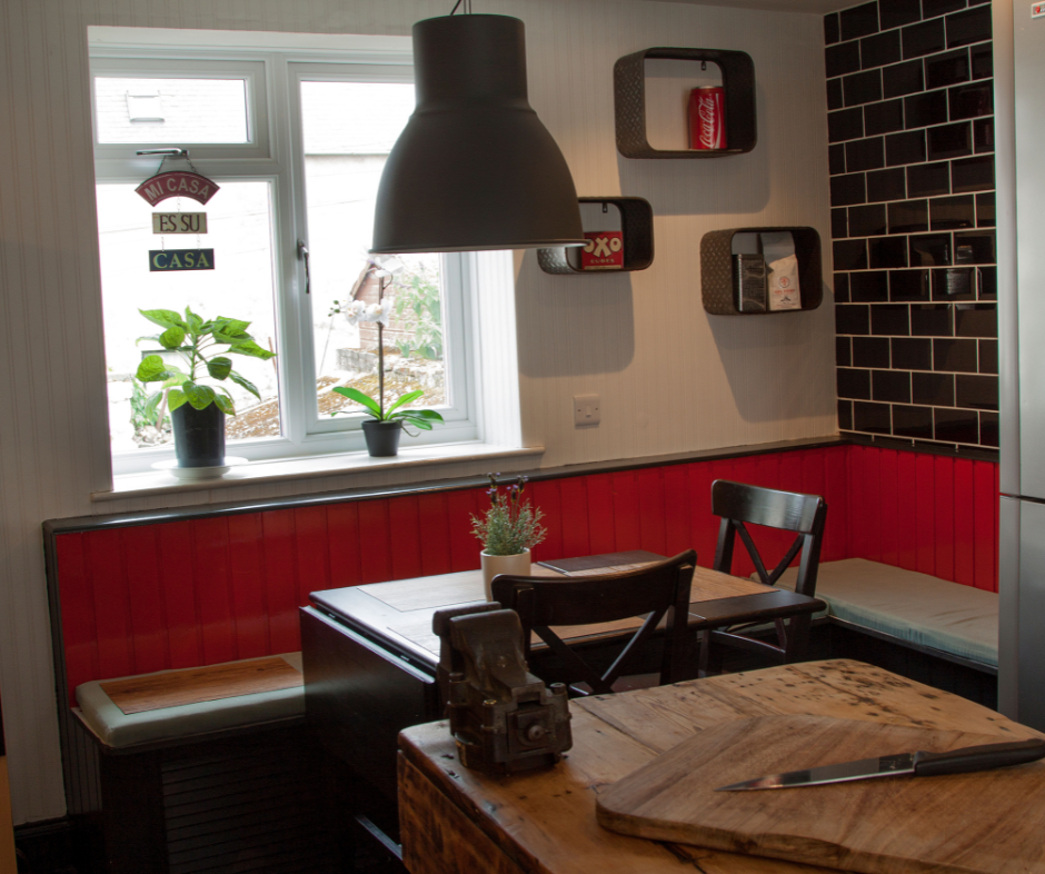Given majority of the budget was spent on the structural works and building warrant, we opted to paint the kitchen cabinets and add a cool workman’s bench to replace the dated island. To make space it was moveable so flexible for storage and prep surface alike. Its patina added to the industrial feel the newly painted cabinets had which was further enhanced by the brick orange paint colour in the space saving built in seat.